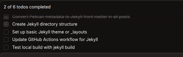 其实我第一次尝试用AI Agent来迁移博客是在一年前,用的就是Google的Gemini Cli,虽然因为token用光没有移植成功,但是它的表现还是让我很满意的。它不像ChatGPT那样基于对话给你来生成,而是你给它一个宏观的命令,譬如“把我的博客从Pelican迁移到Jekyll”,它就会自己去分析这个命令,然后自己去查看情况,自己列一个TODO list,自己去搜索资料,自己去写代码,自己去运行代码,自己去看结果,然后根据结果继续修改代码,直到把这个任务完成了。整个过程完全不需要我来干预,完全不需要我来指导它怎么做,它就能自己去完成这个任务了。虽然最后因为token用光了没有成功,但是它的表现已经让我非常满意了。