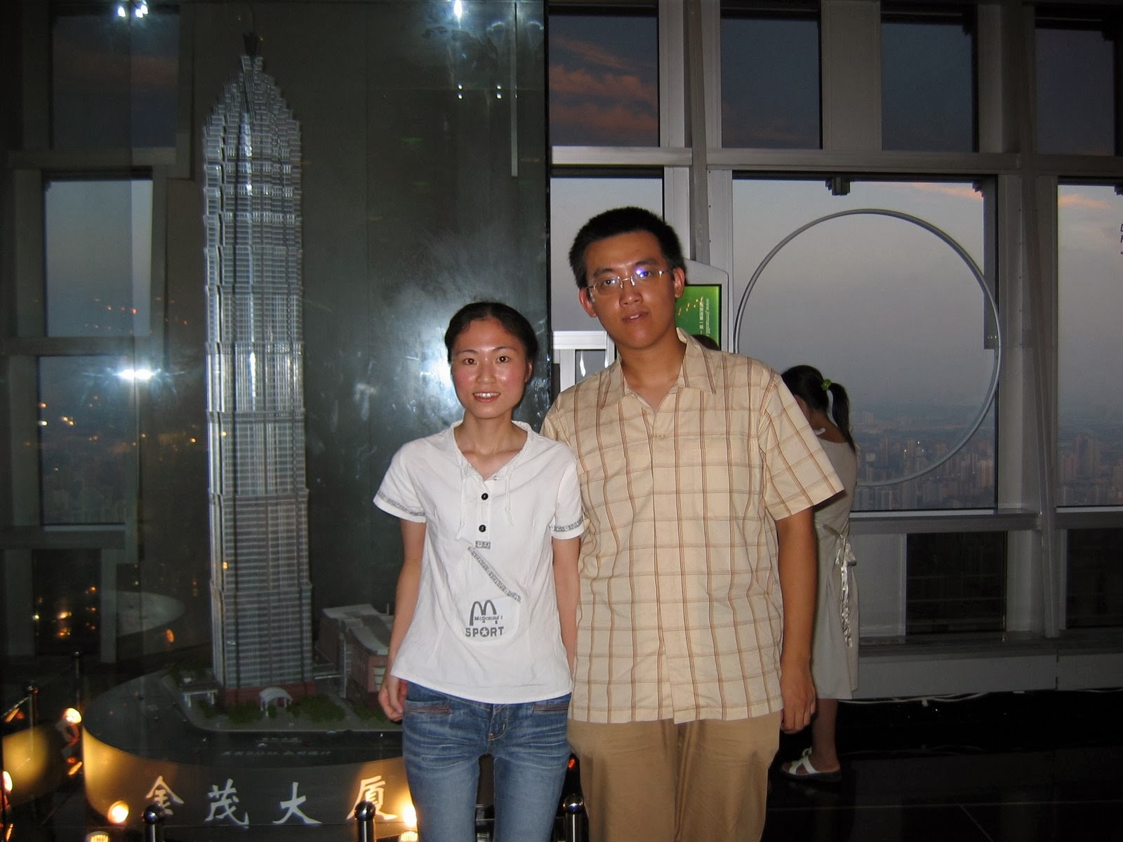 当时还是她主动追求我。晚上请我们几个助教一起吃饭,吃完饭之后说何宗键你留下来一下,其他人可以走了。然后给我劈头盖脸来了一句“我喜欢你”。我当时就惊呆了,半天缓过神来,说了一堆乱七八糟的话,自己都不记得了。然后第二天她就到离学校30公里的惠普去实习去了。后来反正就在一起了。下面是我们两个人第一次出去约会,都从冬天到了夏天了,是在上海当时的最高楼金茂大厦。现在看起来打扮好土。