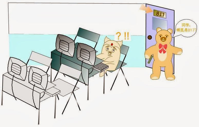 微软实习归来之后,回学校做毕业设计,顺便给低两级的学弟学妹做助教。这段助教生涯让我结识了另一位助教,也是我现在的妻。时间是2004年3月。这是妻用漫画的形式画的我们俩的初次相见。我对数字不敏感,她让我去817找她,我推开817的门,问她哪里是817。
